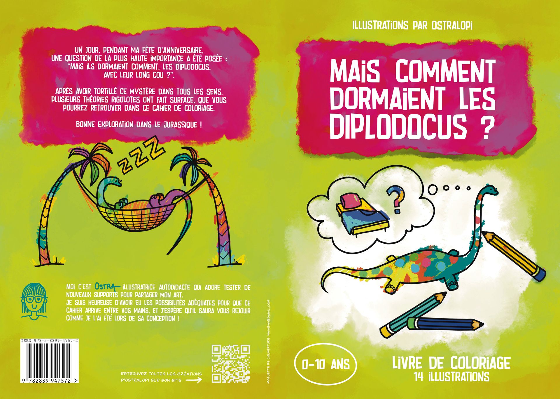Lors de mon repas d'anniversaire en mars 2025, une de mes amies a créé un diplodocus avec sa pizza. En voyant ce looooong cou, je me suis demandé comment ils faisaient pour dormir, les diplodocus. On a lancé quelques hypothèses, et une autre amie a dit sur le ton de la rigolade : "Franchement, si il existe un cahier de coloriage là dessus ça sera énorme".